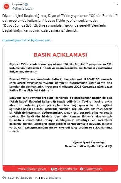 Diyanet İşleri Başkanlığınca, Diyanet TV’de yayınlanan “Günün Bereketi” adlı programda kullanılan ifadeye ilişkin yapılan açıklamada, “Duyduğumuz üzüntüyü ve sorumlular hakkında gerekli işlemlerin başlatıldığını kamuoyumuzla paylaşırız” denildi