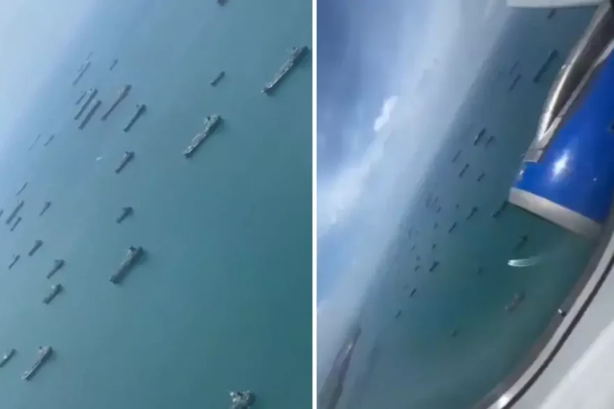 GÖRÜNTÜLERDE UZUN SIRA GÖRÜNÜYOR Uçakla çekilen görüntüler, boğazdan geçmek için izin bekleyen birçok büyük petrol tankerinin denizde uzun kuyruklar oluşturduğunu gösteriyor. Dünya üzerindeki en kritik su yollarından biri olan Hürmüz Boğazı’ndaki bu tıkanıklık, küresel enerji sevkiyatını büyük ölçüde aksattı.